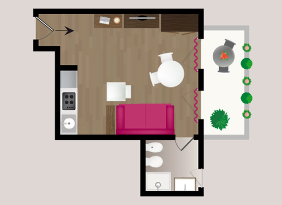 Studios da 26 a 28 mq - raffinati monolocali dotati di salotto con cucina a vista e ampia balconata. Tutti gli Studios sono arredati con gusto ed originalità arricchiti da famosi complementi di design come lampade Kartell e articoli del designers Philippe Starck.